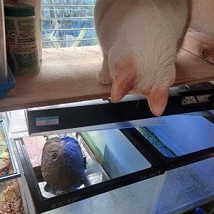 今回の僕の画像、涙をためているように見えるけど、泣いてません。ボスが不在でも僕は僕で、パトロールで忙しいからね。今日は亀から目が離せない。