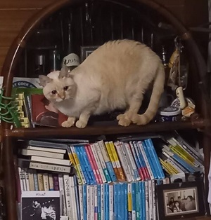 今日は家の仏壇代わりにしている本棚の上にのぼって、しこたま怒られた!